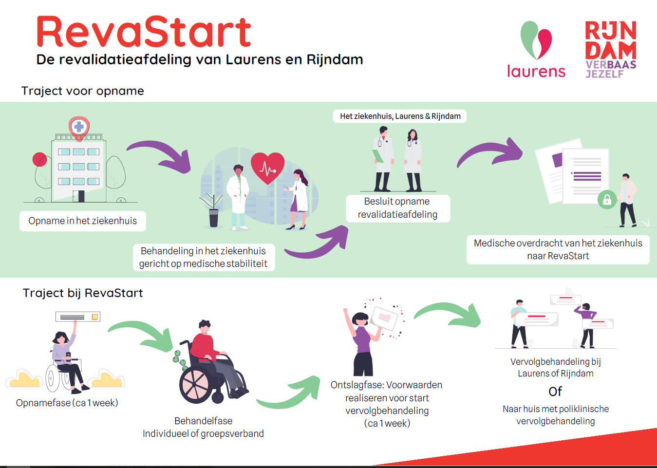 Voor een groep patiënten is in het ziekenhuis niet direct duidelijk welke revalidatiezorg na ontslag het best past. Met RevaStart ontwikkelden Laurens en Rijndam Revalidatie, in nauwe samenwerking met Erasmus MC, een gezamenlijke afdeling en werkwijze. Hier starten patiënten eerder met revalidatie en wordt gerichter bepaald welk vervolgtraject passend is.