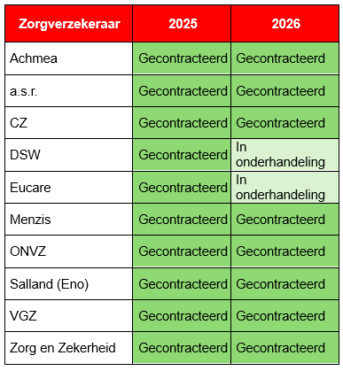 Voor elk jaar maakt Rijndam afspraken met zorgverzekeraars. Hieronder zie je met welke zorgverzekeraars* wij een contract hebben of waarmee we nog in gesprek zijn.